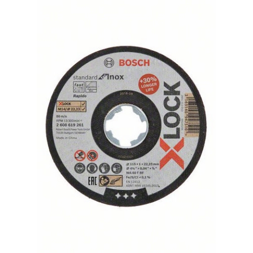 Řezný kotouč Standard for Inox X-LOCK poskytuje spolehlivé řezání nerezové oceli. Tenký disk umožňuje plynulé a snadné řezání. Dále kotouč neobsahuje železitá, sirnatá ani chlorovaná plniva. Řezné kotouče Bosch vyhovují požadavkům na maximální bezpečnost, např. EN 12413. Díky beznástrojovému systému X-LOCK je výměna řezných kotoučů snadná a rychlá.