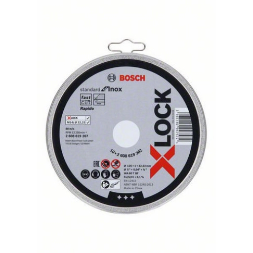 Řezný kotouč Standard for Inox X-LOCK poskytuje spolehlivé řezání nerezové oceli. Tenký disk umožňuje plynulé a snadné řezání. Dále kotouč neobsahuje železitá, sirnatá ani chlorovaná plniva. Řezné kotouče Bosch vyhovují požadavkům na maximální bezpečnost, např. EN 12413. Díky beznástrojovému systému X-LOCK je výměna řezných kotoučů snadná a rychlá.