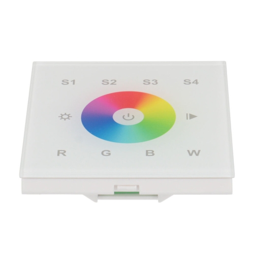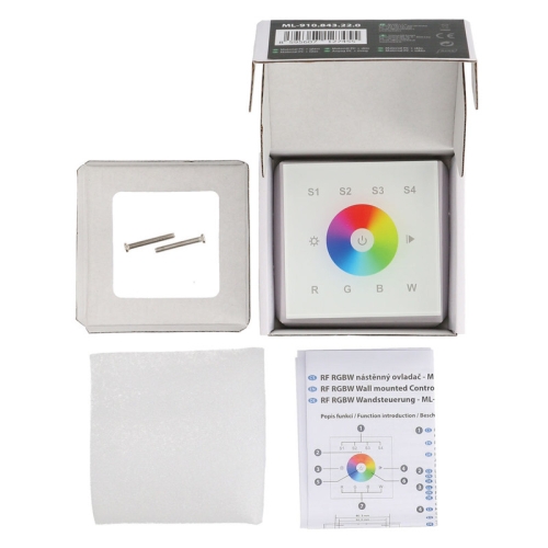 RF dálkový ovladač pro řízení jasu a barevných režimů RGB a RGBW LED pásků umožňuje řízení jedné skupiny RF přijímačů (nejsou součástí), tato skupina může mít neomezeně přijímačů. 10 barevných efektů, 4 scény pro uložení barvy/efektu, dosah cca 20m. Instalace pomocí vrutů (součástí). Rozměry ovladače: 86×86×30,9mm, materiál: plast+sklo, napájení AC230V.