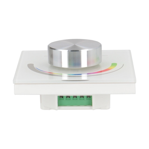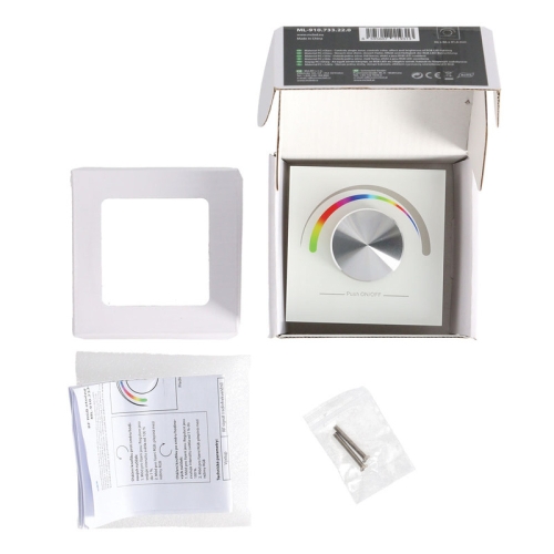 RF dálkový otočný ovladač pro řízení jasu a barevných režimů RGB LED pásků umožňuje řízení jedné skupiny RF přijímačů (nejsou součástí), tato skupina může mít neomezeně přijímačů. Instalace do elektroinstalační krabice pomocí vrutů (součástí). Rozsah stmívání 1 – 100 %. Rozměry ovladače: 86×86×41,6mm, napájení 1x CR2430 baterie (součástí), dosah cca 20m.