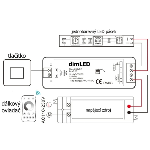 Radiofrekvenční přijímač stmívač pro jednobarevné LED produkty s napětím 5-36V. Přijímač může být ukrytý (za zdí, sádrokartónem či ve skříni), není nutná přímá viditelnost přijímače pro ovladač. Přijímač je kompatibilní se všemi ovladači řady dimLED. Přijímač má svorkovnici pro připojení tlačítka, kterým lze přijímač manuálně ovládat. Lze tedy přijímač ovládat jak dálkově, tak manuálně například tlačítkem. Pro ovládání více okruhů je nutno použít jeden přijímač na každý okruh. Na každý přijímač lze napárovat až 10 různých ovladačů řady dimLED a tak ovládat z několika míst. V případě přerušení a poté opětovného připojení napájení (například přerušením napájení zdroje) má tento přijímač paměť nastavení intenzity (intenzita osvětlení se vrátí na naposled nastavenou). Specifikace přijímače: Vstupní napětí 5-36VDC Proudové zatížení 1x8A (12V 96W, 24V 192W) Přenosová frekvence 2,4GHz Dosah 30m až 100m Počet ovladačů Lze spárovat max. 10ks na 1 přijímač Rozměry 97 x 33 x 18mm Typ stmívání PWM modulace Paměť posledního nastavení po odpojení napájení: ANO Frekvence PWM: 2000Hz Stupeň krytí: IP20