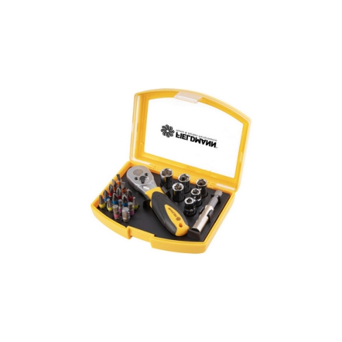 FDS 1018-23R Sada 23 ks Bitů obsahuje: 15 ks 25 mm bitů: H3, H4, H5, H6, SL3, SL4, SL5, SL6, PZ1, PZ1, PZ2, PH2, PH3, T10, T15 6 ks: 1/4 nástavec 5, 6, 7, 8, 9, 10 mm 1 ks ráčna 1 ks nástavec