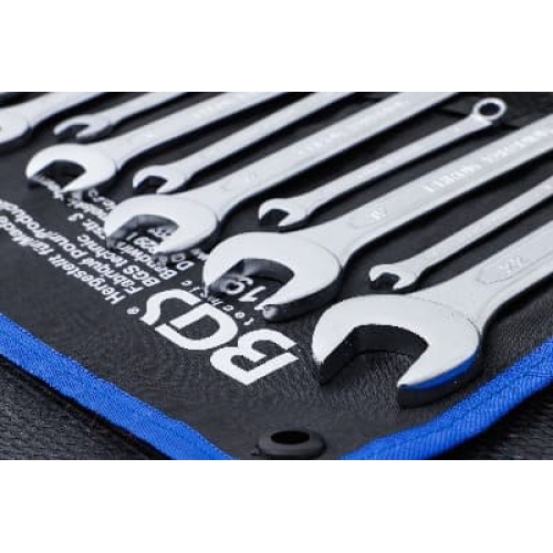 kované za tepla pochromované, leštěné čelisti zakončení kroužku pod úhlem 15° zakončení kroužku s profilem: 12bodové baleno v tetronové peněžence rozsah dodávky: kombinovaný klíč 6 mm kombinovaný klíč 7 mm kombinovaný klíč 8 mm kombinovaný klíč 9 mm kombinovaný klíč 10 mm kombinovaný klíč 11 mm