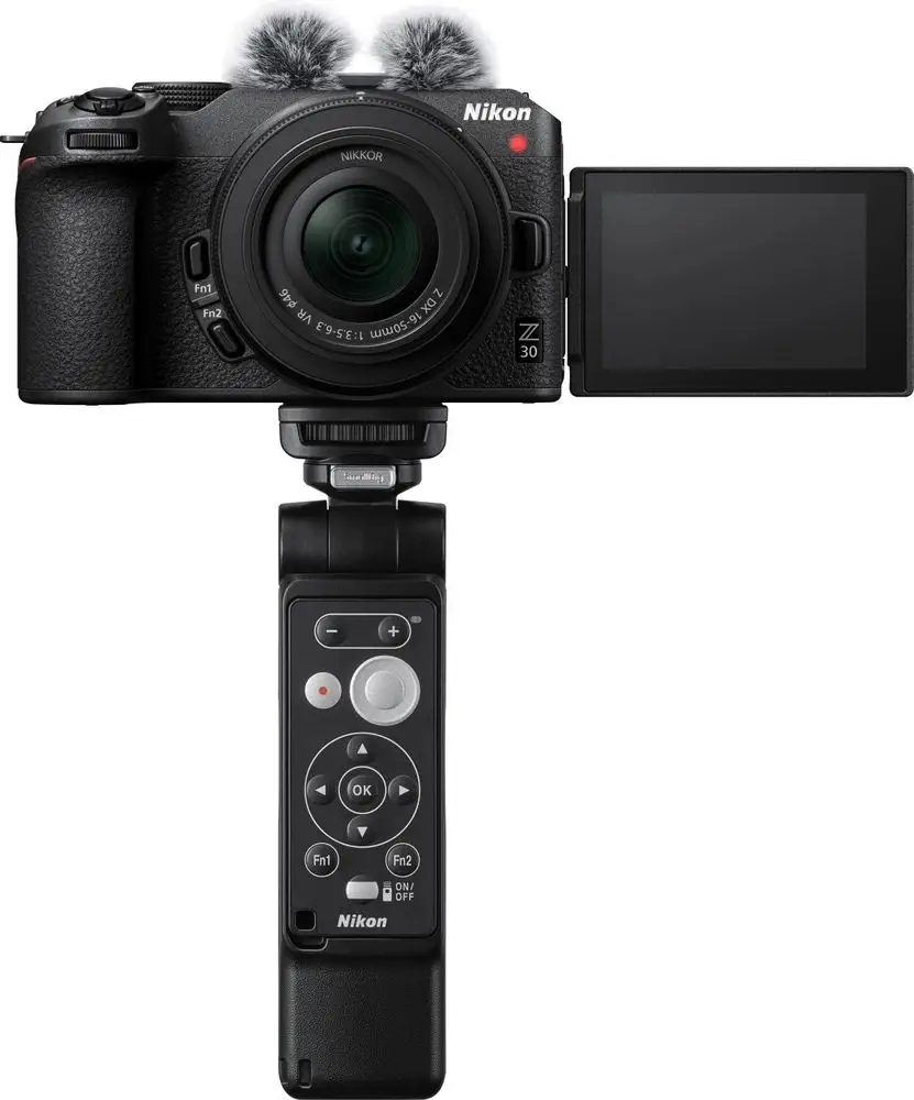 Nikon Z30 + DX 16-50 mm f/3.5-6.3 VR – fotoaparát pro vloggery a fotografy Kompaktní, lehký a moderní – Nikon Z30 s objektivem Nikkor DX 16-50 mm f/3.5-6.3 VR – je jedinečným fotoaparátem, který splní všechna očekávání ambiciózních fotografů, tvůrců videí a vloggerů. Z 30 nahrává v Ultra HD 4K, může fungovat jako webová kamera nebo umožňuje streamování bez dalšího příslušenství. Použití velkého 20.9 Mpix CMOS snímače a uznávaného obrazového procesoru EXPEED 6 zajišťuje vynikající rozlišení a rozsah citlivosti dosahující 51200 ISO – malý Nikon se proto skvěle hodí pro klimatické záběry za slabého osvětlení. Nikon Z30 – užitečné příslušenství pro nahrávání vlogů Nahrávání profesionálně vypadajících videí z Nikon Z30 je tak snadné. S mocí vám přijde praktický set vloggerů. Stativ SmallRig Tripod Grip s funkcí držáku pro selfie. Standardní 1/4″ závit umožňuje rychlou montáž fotoaparátu Z30. Stativ má speciální místo s magnetickým upevněním, kam pohodlně uložíte další prvek sady – univerzální dálkové ovládání Nikon ML-L7. Nikon ML-L7 je dálkový ovladač, který využívá technologii Bluetooth pro připojení k fotoaparátu Z30. Umožňuje ovládání různých funkcí fotoaparátu, včetně změny doby expozice, clony, citlivosti ISO, spouštění závěrky nebo nahrávání videa. Protivětrná clona SmallRig Windsheild byla navržena speciálně pro stereofonní mikrofon zabudovaný v Z30. Připojitelná k patce příslušenství účinně potlačuje šum větru a přispívá tak k lepší kvalitě zvuku ve venkovních scénách. Dodatečné upevnění typu studená patka umožňuje připojení kompaktní LED lampy.