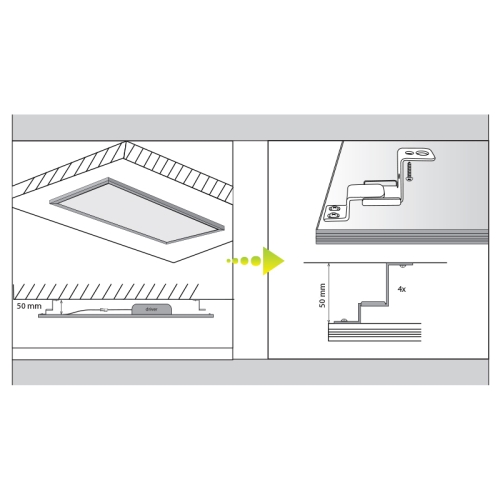 Sada k přisazení LED svítidel McLED Office, můžete díky ní upevnit LED panel ke stropu bez podhledu. Jedna sada postačí k uchycení 1 ks LED panelu McLED Office 6060, k uchycení panelů Office 12030 a 12060 je třeba použít 6 ks úchytů (tedy 2 sady). Mezera 50 mm.