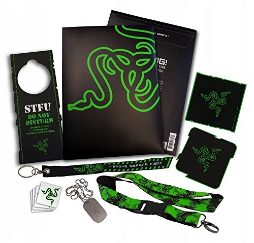 Razer L33. T Pack V5. Balíček doplňků od společnosti Razer. Podložka pod hrnek, samolepky pro zkrášlení desktopu, dvě vodítka, stylizovaný otvírák a přívěsek na dveře, který říká ostatním, aby se drželi dál, protože právě hrajete hru. Jdeš…