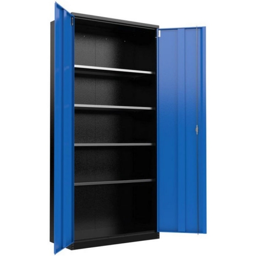 Skříň na nářadí 185 x 85 x 40 cm, určená k využití v domácích nebo údržbářských dílnách, montážních provozech apod. Dvoudveřová celokovová skříň (-> uzamykatelná cylindrickým zámkem; 2 klíče). Vybavení: 4 ukládací police (-> rozměry d x š: 850 x 360 mm; max. nosnost: 30 kg; s volitelným nastavením výšky). Konstrukce: korpus z ocelového plechu, zapuštěná madla (2), barevné provedení: RAL 9005 (rám, police), RAL 5015 (dveře). Dodáváno v rozloženém stavu.
