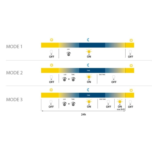 Soumrakový spínač Pokud intenzita světla v okolí klesne pod nastavenou hodnotu, senzor sepne a rozsvítí zapojená svítidla, po opětovném zvýšení intenzity světla spínač svítidla opět vypne Vhodný pro použití v exteriérech, např. v kombinaci se zahradním osvětlením PANLUX 3 režimy pro vyšší úsporu