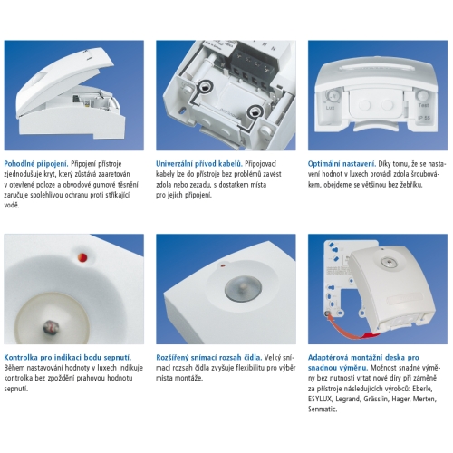 Soumrakový spínač nástěnný LUNA 126 star E: 1 kanál Pouzdro 85x118x49 mm Krytí IP 55 Integrované světelné čidlo Nastavitelný spínací jas 2–200 lx Pevně nastavené zpoždění – při zapnutí 20 s, při vypnutí 80 s Spínaný výkon 2300 W pro žárovky Spínaný výkon 350 W pro LED > 8 W Stand-by příkon 0,6 W Adaptérová deska pro snadnou výměnu
