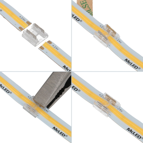 Spojka pro snadné spojení dvou jednobarevných LED pásků šíře 8 mm. Spojka se jednoduše nacvakne přímo na LED pásky, využít lze například pro napojení dvou kratších LED pásků těsně za sebe. Konektor lze použít na LED pásky s jakýmkoli počtem LED/m, pásek se zasune do konektoru a konektor zafixuje kleštěmi (obrázky jsou ilustrativní). Doporučujeme pro max. proud 5,5 A, pro větší proudy je třeba LED pásky k sobě připájet. Rozměry: 9,7 (š) x 15,8 (d) x 3,4 (v) mm.