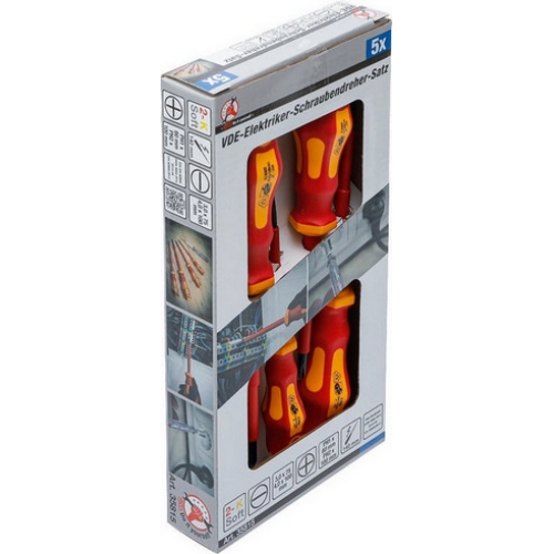 VDE-testováno dle DIN EN 60900 Rozsah dodávky: VDE elektrikářský šroubovák, křížová drážka PH1, 80 mm VDE elektrikářský šroubovák, křížová drážka PH2, 100 mm VDE elektrikářský šroubovák, drážka SL 0,5 x 3 mm, 75 mm VDE elektrikář šroubovák, drážka SL 0,8 x 4 mm, 100 mm zkoušečka napětí s klipem, 140 mm