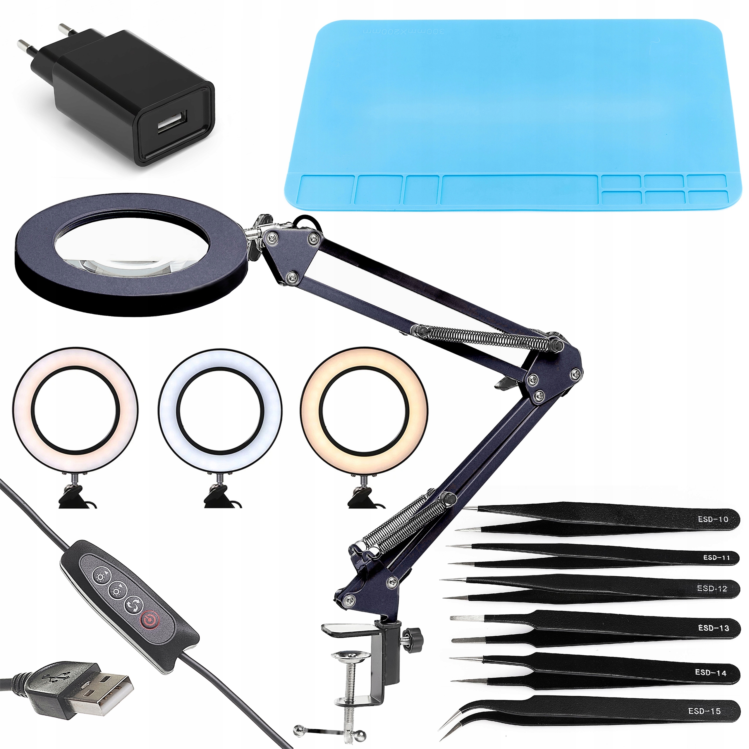 Profesionální sada pro profesionály, která obsahuje LED kancelářskou lampu, silikonovou antistatickou podložku 300 x 200 mm, 6 ESD pinzet a adaptér USB 5W 2A do sítě. Ideální pro přesné ošetření. Vysoká kvalita provedení a spolehlivost.Svítilna s lupou 5x – LED osvětlení 12W