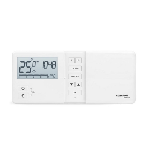 Šetřete náklady na topení a regulujte topnou techniku za pomoci ověřeného termostatu Auraton Tucana, který je vybavený 10 programy nastavení. Tento pokojový termostat pracuje se třemi teplotami – komfortní, úsporná a protizámrazová, případně využijte manuální režim s možností nastavení další teploty nezávislé na programu. Zkuste také režim dovolené, či manuální režim od 1 hod – do 99 dní. Mimo topnou sezonu se prostorový termostat vypne a funguje pouze jako teploměr. Specifikace elektronického termostatu Tucana s týdenním programem, AURATON 2025 Digitální termostat Auraton Tucana snímá teplotu elektronicky a reguluje ji v rozsahu 4°C – 30°C. Přesnost teploty je 0,2°C – 0,4°C. Pokojový termostat je napájen 2x AA bateriemi které jsou součástí balení. Lze u něj nastavit denní i týdenní programy, což znamená, že můžete nastavit jiný program na každý den. Displej je digitální, vybírat můžete ze tří barev podsvícení. Podívejte se i na další kvalitní prostorové termostaty Auraton a další programovatelné termostaty v naší nabídce. Vybírat můžete také z obdobných výrobků značek ABB, Elektrobock, Elko EP, Legrand či Schneider. Termostaty můžete efektivně regulovat například podlahové vytápění, elektrické konvektory či akumulační kamna. Nezapomeňte si do termostatu pořídit kvalitní tužkové AA baterie. Technické detaily termostatu Auraton Provozní teplota: 0 – 45 °C Rozsah řízení teploty: 4 – 30 °C Nastavení teploty po krocích: 0,2 °C Přesnost regulace: 0,2 °C / 0,4 °C / PWM Protizámrazová teplota: 0 – 10 °C Spínání: 0 – 230 V, max. 8 A Napájení: 2 × AA baterie (1,5 V) Programy: 10 spínacích programů (z toho 7 lze individuálně upravit) Displej: podsvícený s volbou tří barev podsvícení Hystereze/regulace: typ senzoru odporový, diferenciální hodnota cca 0,2 K Krytí: IP20 Barva: bílá (přibližná RAL 9010) Montáž: nástěnná / přisazená na stěnu Vždy se řiďte postupem od výrobce. Zásahy do elektroinstalace provádějte jen tehdy, jste-li k takovému úkonu oprávněni. V opačném případě přenechte instalaci na odborníkovi s příslušným certifikátem. Certifikáty výrobku Termostat AURATON Tucana 2025 elektronický s týdenním programem splňuje příslušné normy ČSN. O společnosti Auraton Značka Auraton je lídrem v oblastí termostatů ve střední a východní Evropě a její výrobky můžete najít ve více než 20 zemích světa. Vývojová centra a výrobní linky značky AURATON se nacházejí v Polsku.