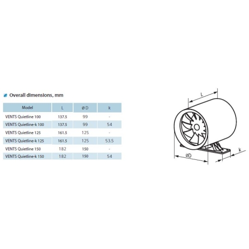Ventilátor VENTS 100 QUIETLINE – do potrubí, tichý, úsporný, kuličk. ložiska, montáž do potrubí, 25dB, 7,5W, IPX4, bílý, 100m3/h.Domovní axiální ventilátor Vents QUIETLINE je určen k odsávání vzduchu z menších bytových prostor jako jsou koupelny, toalety, kuchyně a to díky své tichosti a úspornosti. Ventilátor se montuje přímo do potrubí. Vzhledem ke svým technickým parametrům se doporučuje ventilátory používat v kombinaci s kratším vzduchotechnickým potrubím. Ventilátory typové řady QUIETLINE jsou již v základu vybaveny kuličkovými ložisky, což umožňuje montáž v jakékoliv poloze nebo jejich využití k nepřetržitém dlouhodobém provozu. Všechny motory jsou vybaveny tepelnou pojistkou. Kryt a vrtule ventilátorů je vyrobena z vysoce kvalitního ABS plastu odolnému vůči UV záření. Tvar vrtule zajišťuje efektivnost a trvanlivost ventilátorů. Ventilátory mohou ovládat pomocí samostatného přepínače nebo mohou být zapojeny paralelně s osvětlením. Modely označené „T“ jsou vybaveny časovým spínačem s nastavitelným doběhem v rozsahu od 2 do 30 minut. Ventilátory se montují do kulatého potrubí. Typy s označením „k“ jsou vybaveny držákem na povrch.