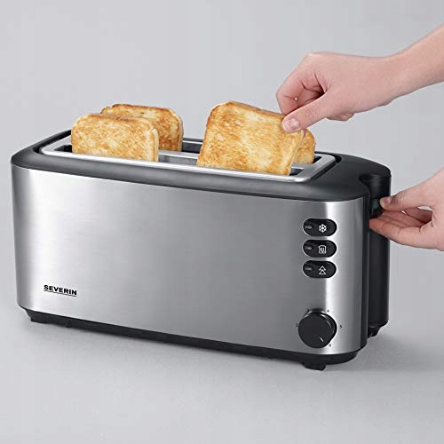 Toustovač Severin Toaster AT 2509 nerez stříbrná/šedá 1400W Plátky chleba rovnoměrně zhnědnou a po zmrazení získají plnou chuť ve fázi rozmrazování.Vlastnosti produktu: dvojitá stěna chránící před popálením, tepelně izolované pouzdro z nerezové oceli, vestavěná podpora pro ohřev rohlíků a croissantů, 2 podlouhlé komory až pro 4 tousty najednou, elektronický regulátor pečení s teplotním čidlem, regulace stupně zhnědnutí, tlačítko odmrazování s kontrolkou, tlačítko pro ohřev (bez zhnědnutí) s kontrolkou, tlačítko zastavení cyklu s kontrolkou, regulace šířky komor zajišťující rovnoměrné propečení, automatické vypnutí v případě zaseknutí chleba, zásobník na drobky, úložiště napájecího kabelu Specifikace: Výkon: 1400 W Barva / materiál: broušená nerezová ocel, černá Čistá hmotnost: 2,04 kg Rozměry: délka x šířka x výška: 39,7 x 15,7 x 18,5 cm Kapacita: 4 plátky Složení setu: toustovač, Záruční list, zásobník na drobky