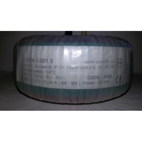Toroidní (vinutý) transformátor s tepelnou vratnou pojistkou 130° C. Vstupní napětí 230. V, výstupní napětí 11,5. V, výkon 150. VA, max. příkon 150. W, rozměry (průměr x výška) 102mmx46mm