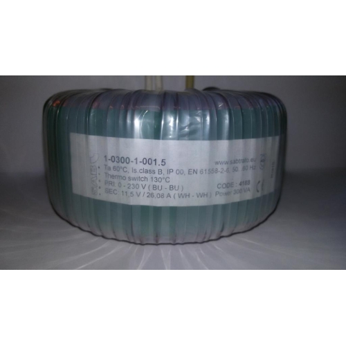 Toroidní (vinutý) transformátor s tepelnou vratnou pojistkou 130° C. Vstupní napětí 230. V, výstupní napětí 11,5. V, výkon 300. VA, max. příkon 300. W, rozměry (průměr x výška) 119mmx63mm