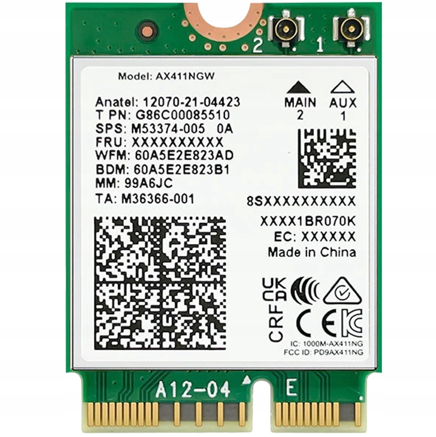 ⚡Vnitřní síťová karta Intel AX411 WiFi 6E 802.11AX 6GHz M.2 CNVio2 5374 Card⚡Síťová karta Intel Card AX411 WiFi 6E 802.11AX 6GHz M.2 CNVio2AX411.NGW je vysoce integrovaný a ekonomický bezdrátový adaptér, který poskytuje rozhraní NGFF M2 (2230) a plnou kompatibilitu se standardy 802.11n/b/g/a/ac/ax. Rychlost bezdrátového přenosu může dosáhnout až 5374 Mb/s .Pomocí této bezdrátové síťové karty AX411 můžete nejen připojit počítač k vysokorychlostní síti Wi-Fi a užívat si tak rychlejší přenos souborů, ale také zvýšit dosah internetu ve svém domě.Pozor! Pokud karta funguje správně, ale nevidí Bluetooth, je to pravděpodobně způsobeno tím, že rozhraní na disku nepředpokládalo takový typ ovládání.Specifikace síťové karty:Podporované standardy: 802.11n/b/g/a/ac/axFrekvence signálu: WiFi (2.4 GHz, 5 GHz, 6 GHz), Bluetooth (5.3)Rychlost přenosu: až 5374Mbps (2.4GHz až 574Mbps, 5GHz až 2400Mbps, 6GHz až 2400Mbps)Čipová sada: AX411NGWPodporované operační systémy: Win10 / Win11 64-bit, LinuxPožadavky na instalaci: základní deska s procesory 12. generace nebo novější a protokolem M2 CNVio2WiFi adaptér: bezdrátovýTyp rozhraní: M.2 2230Balíček obsahuje:1x síťová karta Intel AX411NGW