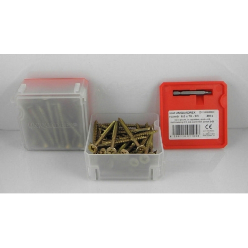 Pořiďte si výhodné balení kvalitních ocelových šroubků od firmy Uniquadrex. Vruty prodáváme v praktickém balení – plastových UQ boxech s červeným víčkem. Vruty Uniquadrex se zapuštěnou hlavou mají UNIQUADREX drážku pro speciální bitový nástavec, který je součástí balení. Mají ale i křížkovou drážku pro povolení, když není tento bit k dispozici. Jsou dlouhé 50 mm s průměrem 6 mm. Prodávají se po 50ti kusech. Vybírejte ze všech šroubů a vrutů na našem e-shopu, nebo si vyberte vhodný hřebík. Zvažte také, jestli nepotřebujete přikoupit i hmoždinku, nabízíme například hmoždinky do sádrokartonu, hmoždinky do polystyrenu, hmoždinky do Ytongu či jiného pórobetonu či do plného zdiva. Kromě toho u nás najdete i další spojovací materiál, jako jsou stahovací pásky, lustrháky či kabelové příchytky. O výrobcích Uniquadrex Vybírejte z vrutů Uniquadrex které vynikají výbornou drážkou, která kombinuje speciální čtyřhran pro lepší šroubování dodaným bitem, tak běžný křížový systém.