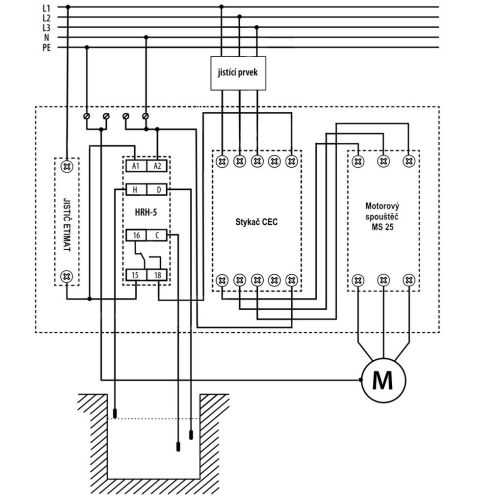 Vybavený rozváděč pro hlídání hladiny ETI HRH-ECH-MS4-CEC 004483601 pro třífázový motor výkonu 1,1-1,5kW, krytí IP65. Jednoduchým způsobem automatizujete provoz čerpadla tam kde je potřeba odčerpávat vodivé kapaliny z nádrže při dosažení maximální úrovně hladiny pomocí 3-fázového čerpadla. O vše se postará tento komplet s hladinovým relé HRH-5, stykačem a motorovou ochranou. Provedení rozváděče ETI HRH-ECH-MS4-CEC se stykačem nenamáhá relé většími proudy motorů, spínání čerpadla provádí motorový stykač s kontakty dimenzovanými na zátěž AC3. Vše je připraveno a zapojeno v plastové rozvodnici ECH s krytím IP65 a průhlednými dvířky. Stačí připojit jen potřebný počet sond (nejsou součástí sestavy – nutno objednat zvlášť) Automatizace spouštění čerpadla v nádobách s vodivou kapalinou pomocí relé HRH-5 Komplet má jištění pouze pro relé a stykač – nutno předřadit vhodný jistící prvek pro čerpadlo Instalace na nehořlavé podklady do prostředí bez přímého slunečního záření. Materiál rozvodnice je UV stabilní, krytí IP65. Možnost volby hlídání jedné nebo dvou hladin Napájecí napětí: 230V AC Jistič ovládání zkratové odolnosti 10kA Nastavitelné hladinové relé HRH-5 Stykač CEC 09.10-230V-50/60Hz Motorový spouštěč s ochranou proti přetížení i zkratu, pro výkon motoru 1,1-1,5kW Na přání lze vyrobit i pro další výkony motorů čerpadel