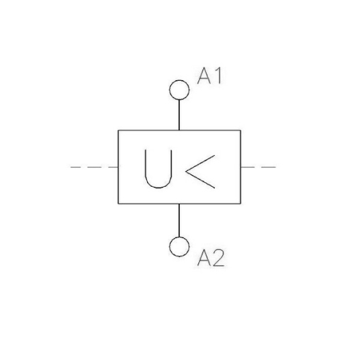 Podpěťová spoušť k našroubování, jmenovité provozní napětí 400V AC, funkce bez zpoždění, frekvence 50-60Hz, práh zapnutí 80% z Un, práh spuštění pod 50 % Un, vestavný rozměr víčka 45 mm, šířka při montáži 1HP (17,5 mm), montáž na montážní lištu, průřez svorky 1-2×2,5 qm²
