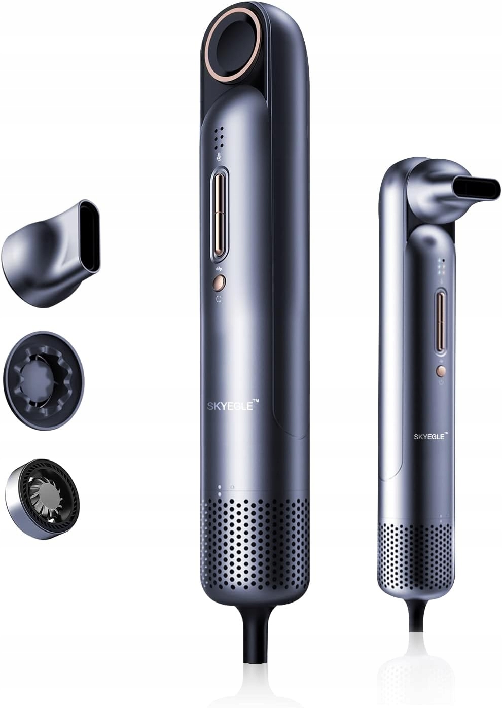 Regulovatelné nastavení tepla a rychlosti větru: Skygle je vybaven otočnou magnetickou tryskou o 360°: 1 koncentrační a 1 difúzní tryskou, aby přesně splňovala požadavky všech vysoušečů vlasů. Nabízí 3 nastavení vytápění a 3 rychlosti větru, které lze ručně zvýšit nebo snížit na nízkou, střední nebo vysokou podle vašich představ.