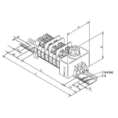 Odbočovací, čtyřvodičová svorkovnice s jedním držákem pojistky E14. Složení svorkovnice: 9 x RSA 16 A 1 x RSA PE 16 A Rozměry: A [mm] 75 B [mm] 73 C [mm] 181 C1 [mm] 40 L [mm] 300 • Materiál izolantu polyamid PA 6, hořlavost V0 dle UL 94, bez halogenů • Nadstandardní povrchová úprava spojovacích i elektrovodných částí • Možnost připojení hliníkových i měděných vodičů • Vodivě spojené svorky PE s lištou DIN • Krytí IP 20 bez nutnosti používání příslušenství či krytů • Oddělení fázových svorek středovými přepážkami • Svorky v sestavách svorkovnic jsou označeny popisem • Certifikace státní zkušebny a soulad s normami EU