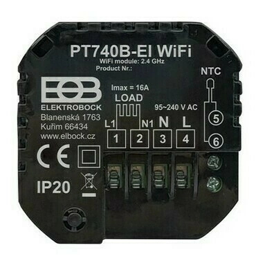 Vlastnosti WiFi termostatu PT740W/B-EI WIFI: Je vhodný pro domácnosti, rodinné domy, kanceláře s elektrickým vytápěním. Může zapínat přímotopy, elektrické sálavé panely nebo elektrické podlahové topení až do proudu 16 A nebo ovládání termoelektrických ventilů teplovodního podlahového topení. Ovládání a nastavení pomocí aplikace Tuya: Aplikace pro android Aplikace pro iOS Výhody PT740W/B-EI WIFI: podsvícený LCD displej externí čidlo je součástí balení nastavitelná hystereze od 0,5°C do 5°C nastavení teplotních programů s 6ti změnami na den (po-pá, so, ne) možnost připojení externího čidla nastavení maximální mezní hodnoty teploty podlahy režim „OKNO“ funkce geolokace korekce aktuální teploty možnost zámku kláves automatická změna zimní/letní čas volba zapnutí/vypnutí protizámrazové teploty snadná montáž Technické parametry: Napájení 2: síťové (230 VAC/ 50 Hz) Typ termostatu: s WiFi modulem (2.4 GHz) Typ regulace: hystereze (0,5°C až 5°C) Přesnost: 1°C Rozměry (DxŠxH): 86x86x43 mm Stupeň krytí: IP20 Pracovní teplota: 0 °C až 45 °C Spínací prvek: relé Výstup: 16 A Teplotní změny na den: 6 Rozsah nastavitelné teploty: 5 °C až 99 °C Nastavení teplot po: 0, 5 °C Min. programovací čas: 10 min Min. indikační skok: 0, 5 °C Možnost připojení externího čidla: ano Třída ochrany: II Zálohovací baterie: Ne Záloha paměti: Ano