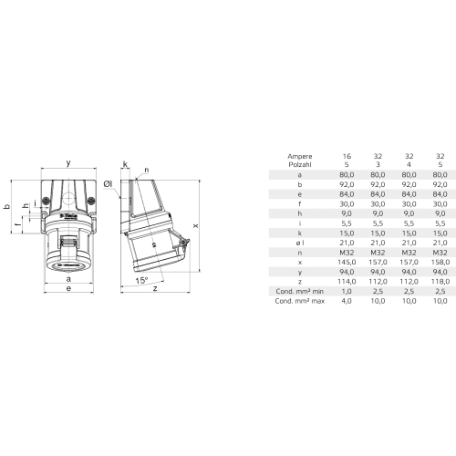 Zásuvka nástěnná INNOLINQ QC 32. A 5p (3. P+N+PE) 400. V (200/346 – 240/415. V~) 6h IP44, Frekvence: 50/60. Hz, Rozlišovací barva: červená RAL 3000, Rozměr pouzdra: 92×94 mm (Vx. Š), Materiál pouzdra/kontaktů: nosič kontaktů je vyroben z tepelně vysoce odolného…
