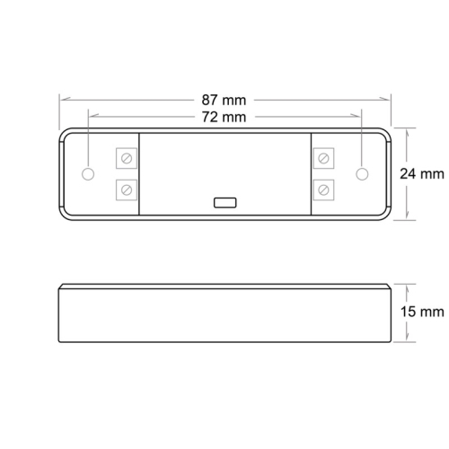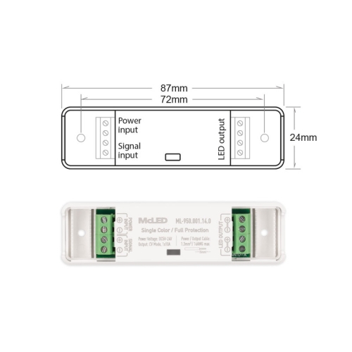 Zesilovač signálu pro jednobarevné LED pásky. Připojuje se za RF přijímač a umožňuje synchronní řízení (přenášení nastavené úrovně stmívání) dlouhých úseků jednobarevných LED pásků pomocí jediného ovladače (není součástí), PWM signál. Rozměry: 87x24x15mm. Vstupní napětí: DC 5-24V. Celková max. zátěž 10A: 120W/12V, 240W/24V.